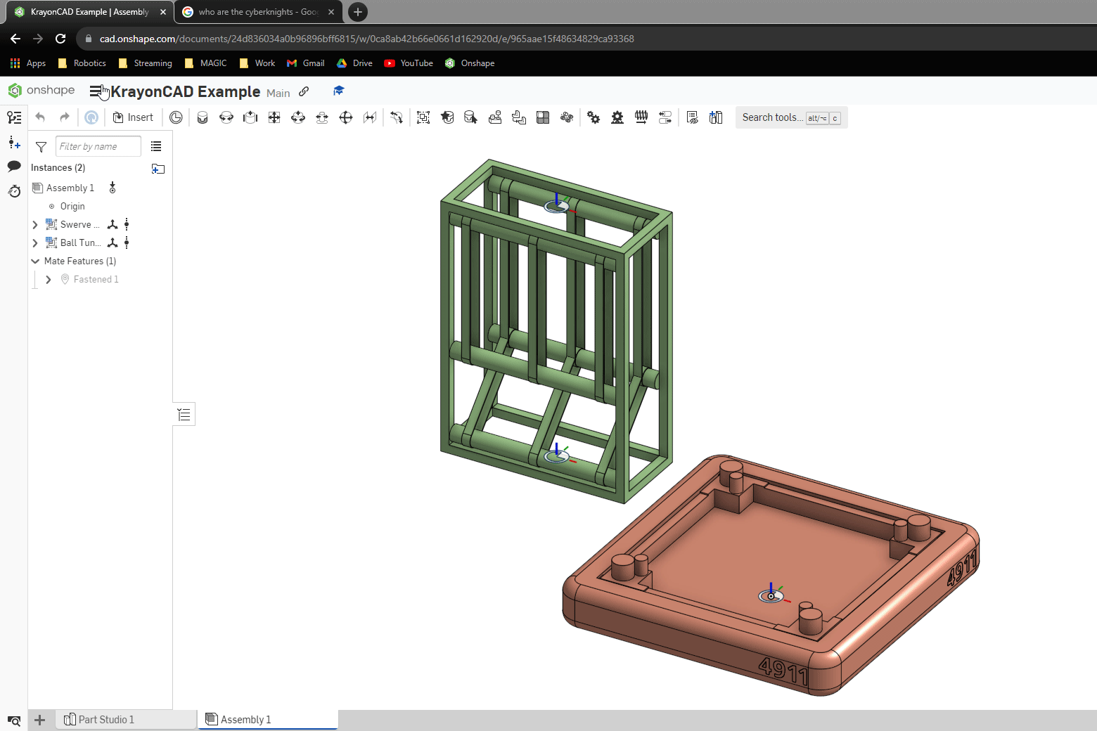 Insert: From any Onshape assembly, use the FRCDesignApp to insert a KrayonCAD Assembly. You can configure the Assembly before inserting.